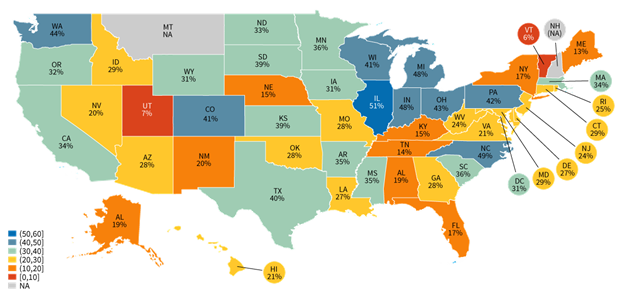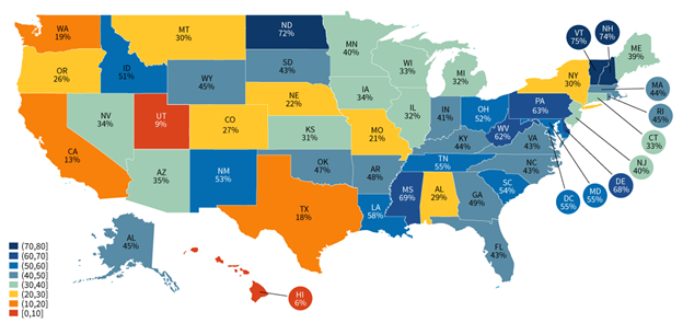 Figure 1: Percent of office-based physicians engaged in interstate data sharing, by state, 2019-2021