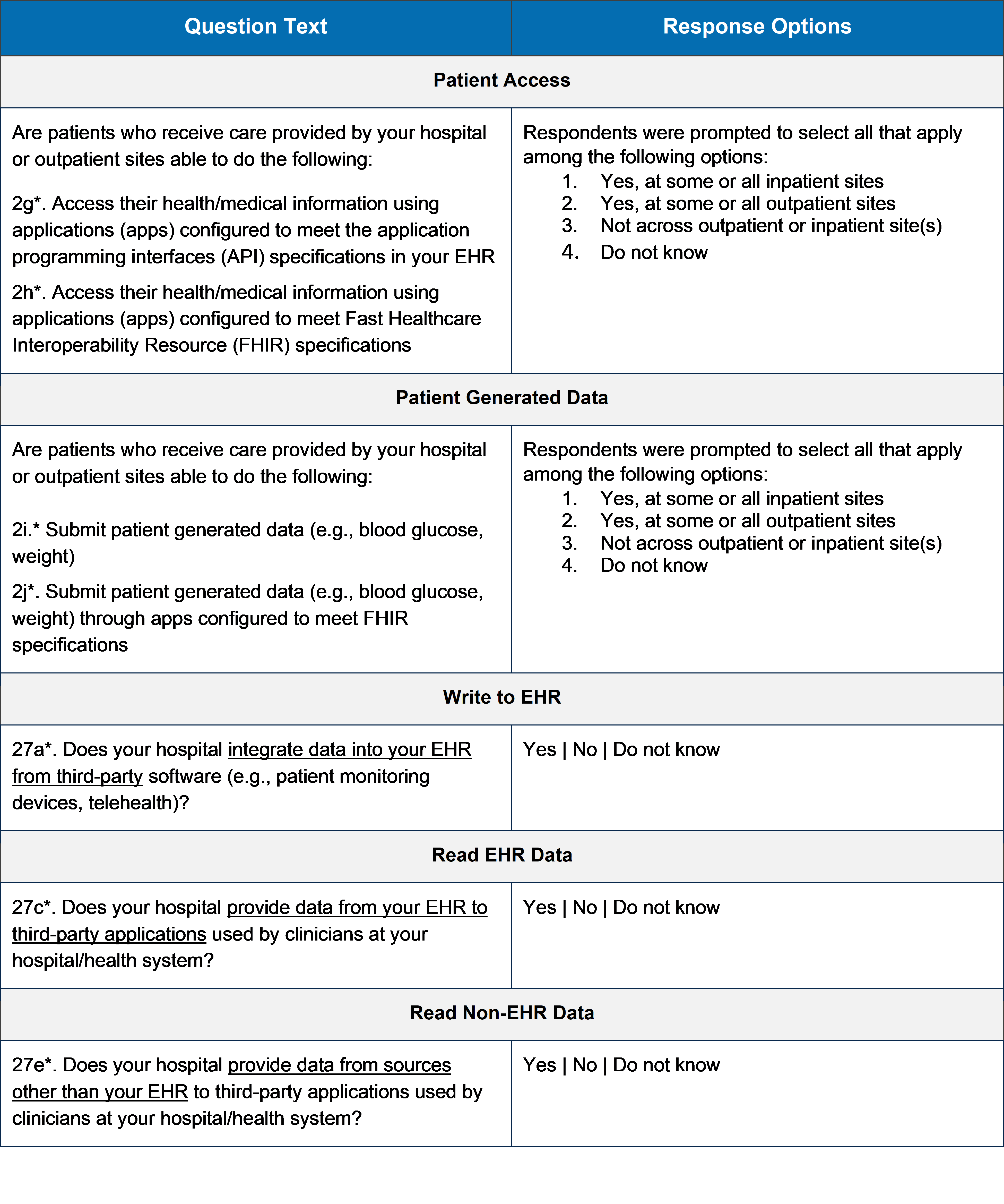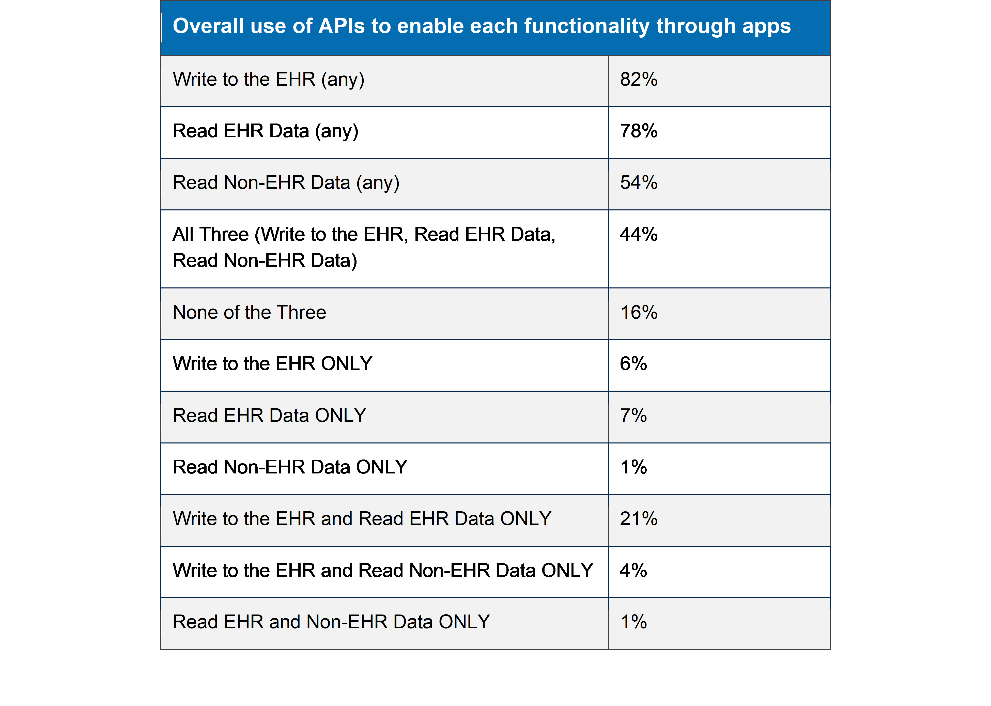 Strawley C., Everson J., Barker W. Hospital use of APIs to Enable Data Sharing Between EHRs and Apps. Office of the National Coordinator for Health Information Technology. Data Brief: 68. 2023.