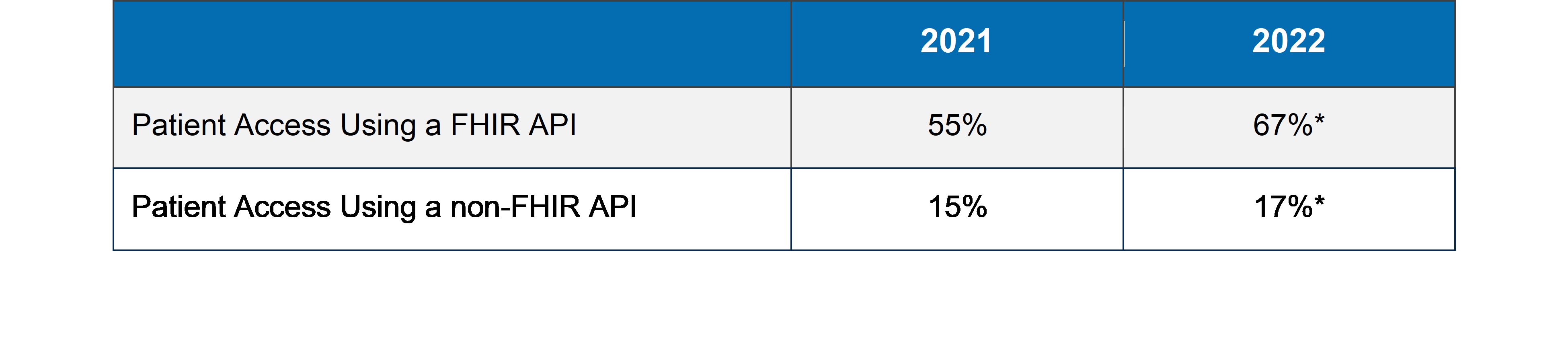 This data brief highlights findings from the 2020 (fielded in 2021) and 2022 American Hospital Association (AHA) Information Technology (IT) Supplements to measure, after the publication of the 2020 ONC Cures Act Final Rule, the proportion of non-federal acute care hospitals using patient and provider-facing APIs to share data with apps to enable patient access, submission of patient generated health data (PGHD), and inform clinical practice. The 2022 AHA Health IT supplement contained new questions to assess hospital use of APIs to enable clinician apps to write data to and read data from the EHR, as well as read non-EHR data. Descriptive statistics for these questions are presented for the first time below.