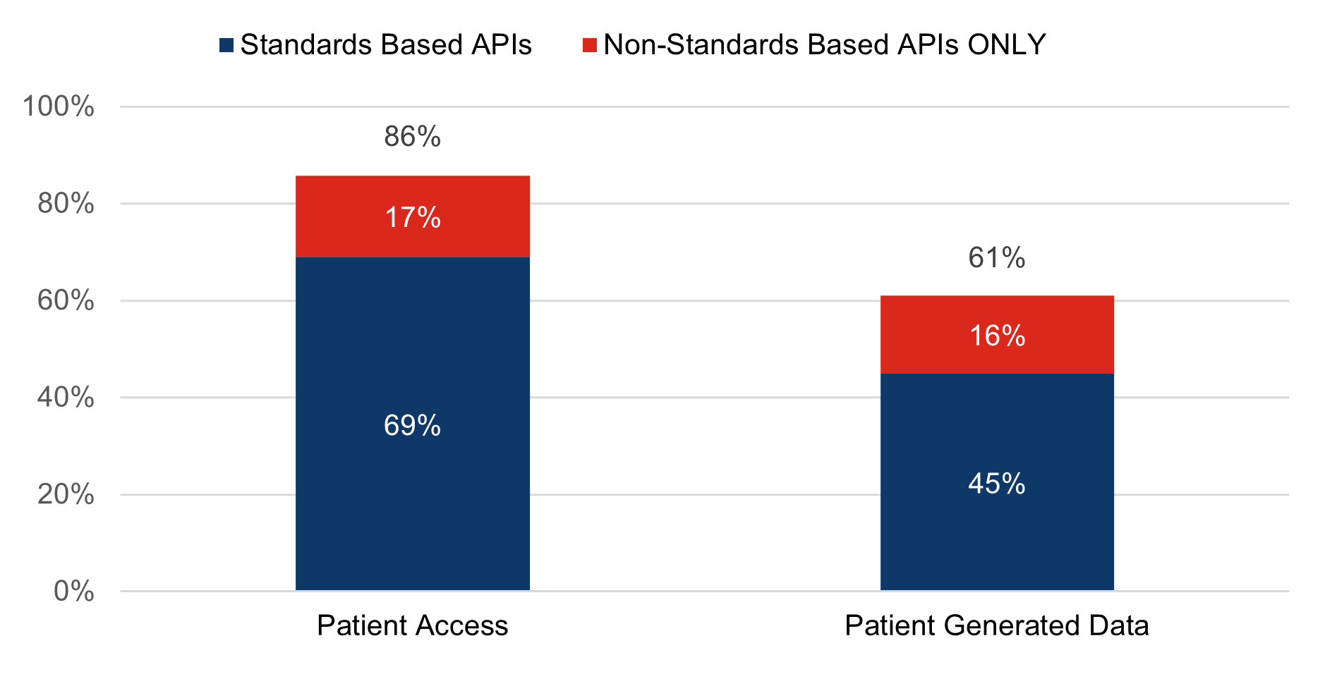 In 2022, 4 in 5 non-federal acute care hospitals used an API of any type to enable patient access to their health information through an app. About 70% of hospitals enabled access to patient data through a standards-based API. These APIs largely meet the specifications of the “Standardized API for Patient and Population Services” certification criterion, which adopts the FHIR and USCDI standards to standardize the API interaction and payload. Fewer hospitals reported providing patients the ability to submit patient generated health data from an app (61%), but most reported enabling this through a FHIR app. The results show wide use of APIs and apps to enable these patient-facing services, but the survey data limits our understanding of the exact types of data patients may submit through an app. Furthermore, the survey data do not provide insight into the share of data exchange or types of data exchanged across standards-based and non-standards-based APIs.