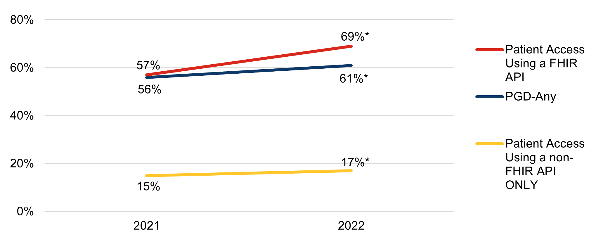 Figure 2: Percent of hospitals that reported using APIs to enable patient access and submit patient-generated data to apps, 2021-2022