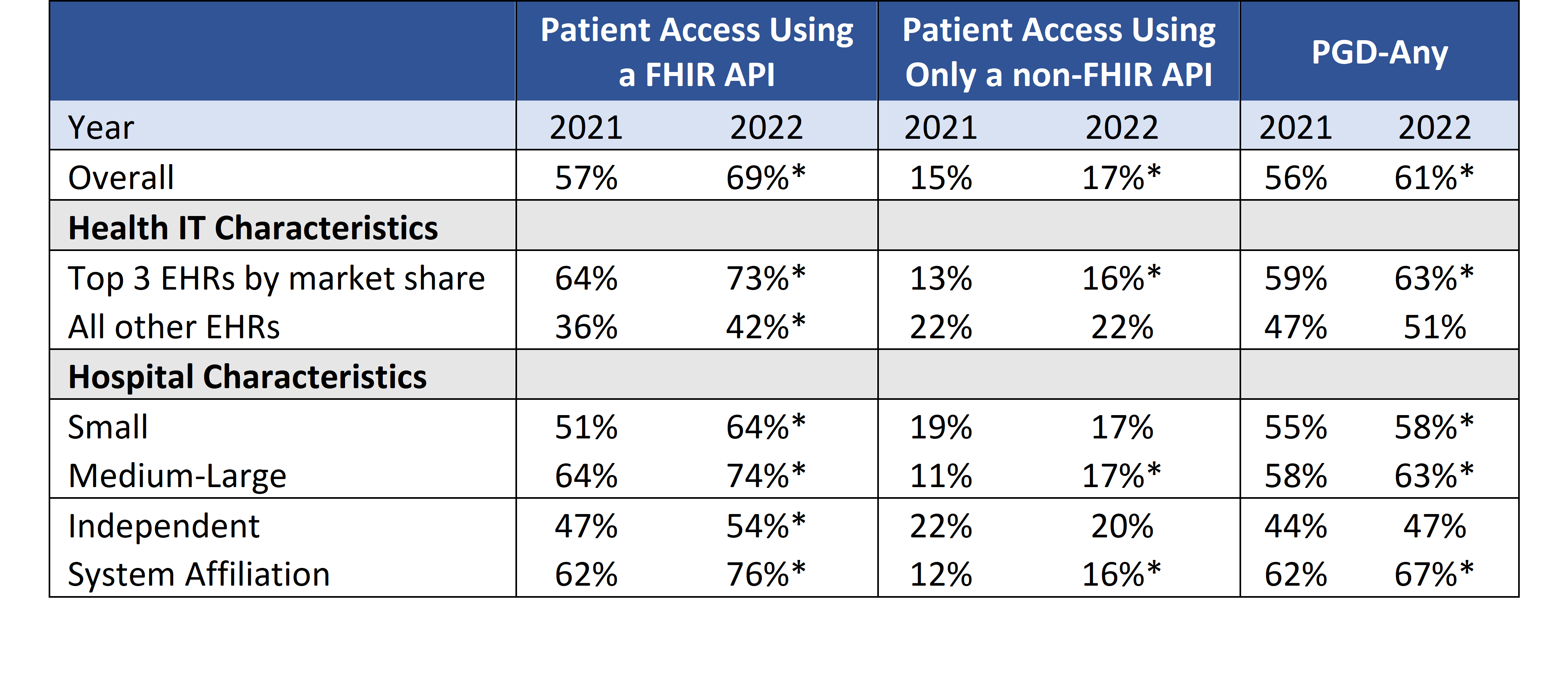 Hospital use of patient APIs for data sharing has increased year-over-year. Regardless of hospital and health IT characteristics, hospital use of a FHIR API to grant patient access to data through apps increased by 12 percentage points between 2021 and 2022. In comparison, exclusive use of non-FHIR APIs did not increase for several hospital types and only increased by 2 percentage points overall. Use of any API to allow patients to submit patient-generated health data (PGHD) to apps increased by 5 percentage points. However, this trend was not consistent across all groups of hospitals when stratifying by hospital and health IT characteristics. No statistically significant increases in use of any API to submit PGHD were observed for hospitals using non-market leading EHRs or for independent hospitals.