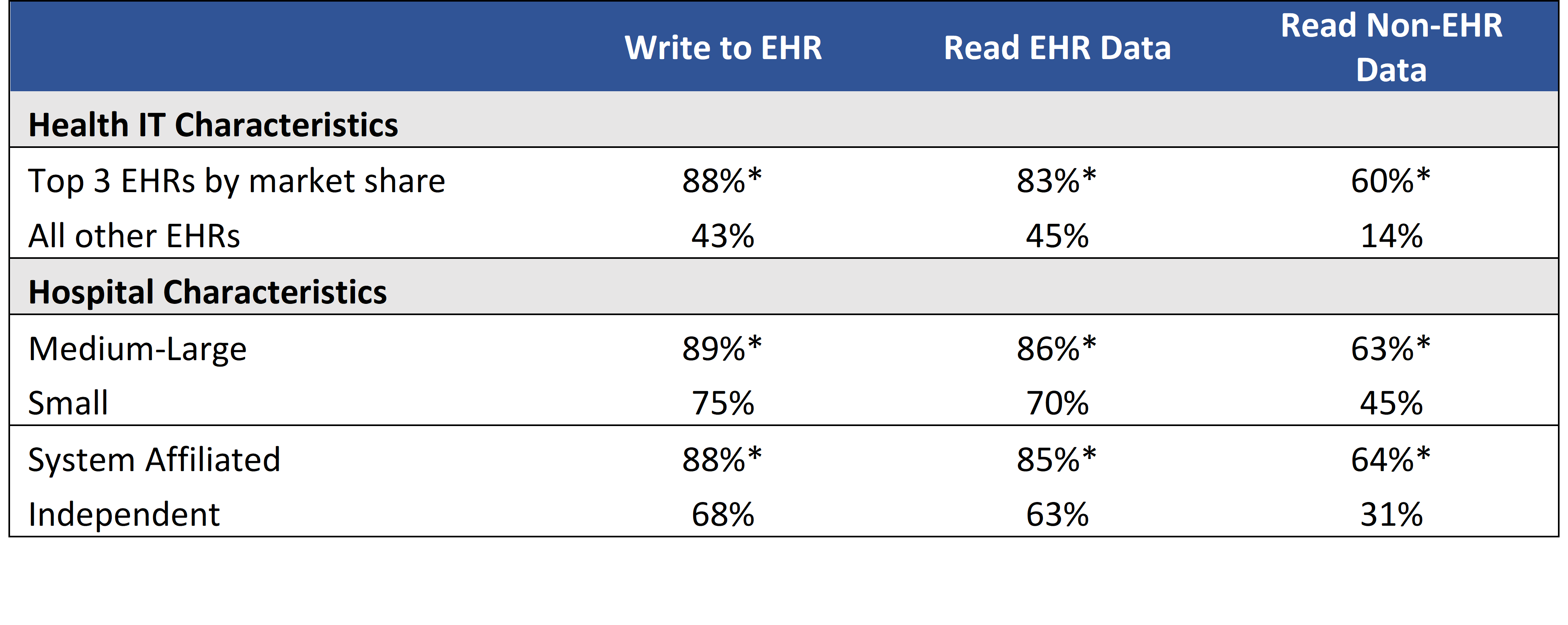 Despite overall advancements in hospital use of APIs after the Cures Rule, hospitals that use a non-market leading EHR, that are smaller, and that are not system affiliated trail behind their counterparts in use of APIs for interoperable exchange. We note that these hospitals are less likely to use a FHIR API for patient access and any API to enable PGHD submission compared to their counterparts, as well as to enable apps to read EHR data, write data to the EHR, and read non-EHR data. This trend is something we intend to follow as part of future AHA surveys and the continued implementation of Cures Rule requirements.