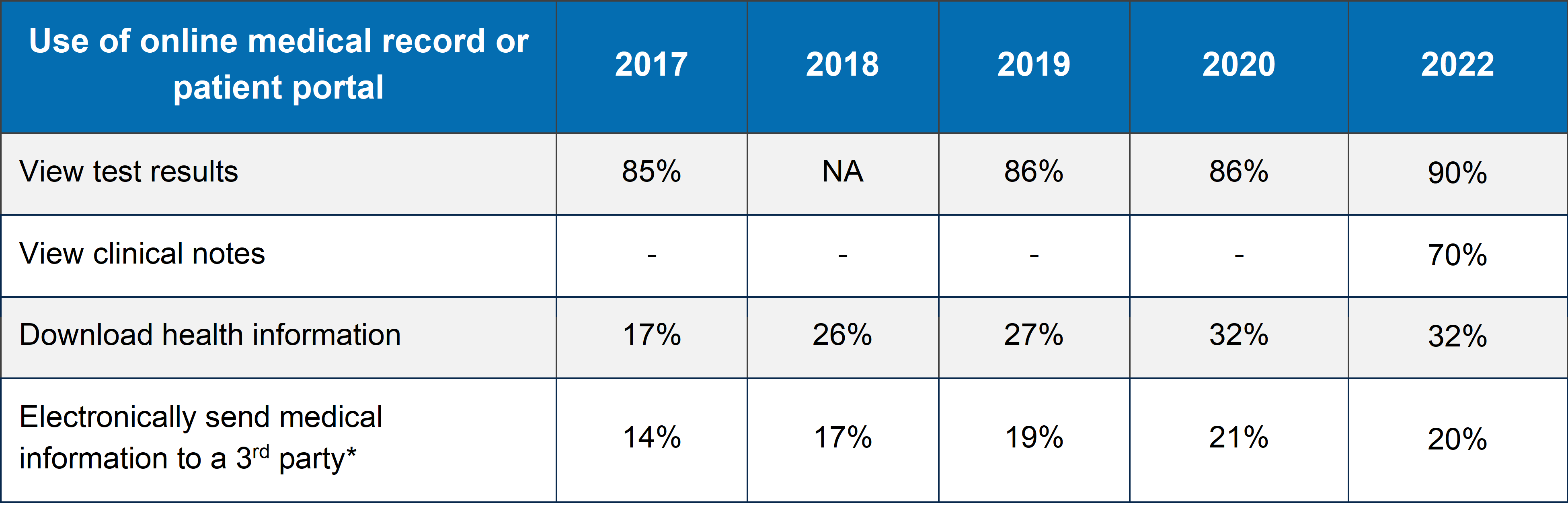 In 2022, most individuals who accessed their online medical records or patient portals used them to view test results (90%) or clinical notes (70%), which is consistent with the most common uses of online medical records reported in 2020 (3). Fewer individuals reported using their online medical records or patient portals to download health information or electronically transmit the data to a third party. This may reflect lower patient demand for download and transmit functionalities or indicate a lack of awareness of these options for sharing their data. Low use of the transmit function in online medical records or patient portals may also indicate challenges on the receiving end, as recipients must have the technical capability to receive data and incorporate it into their systems.