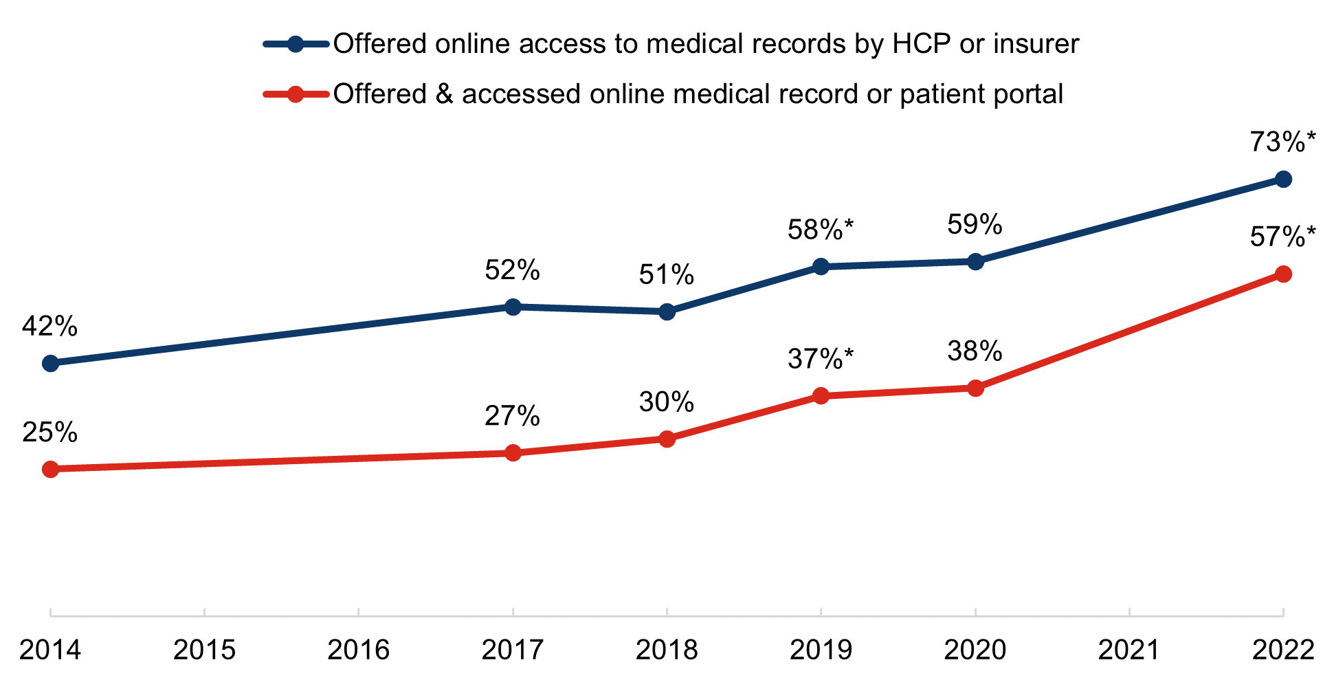 Figure 1: Percent of individuals nationwide who were offered and accessed their online medical record or patient portal, 2014-2022.