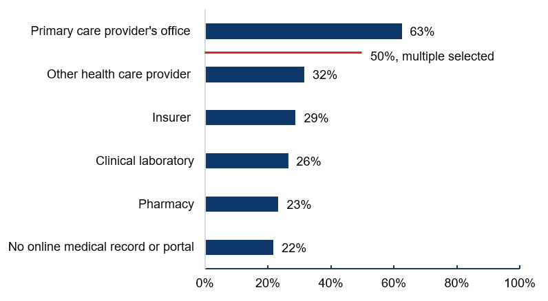 Figure 6: Organization/provider types with which individuals have an online medical record or patient portal, 2022.