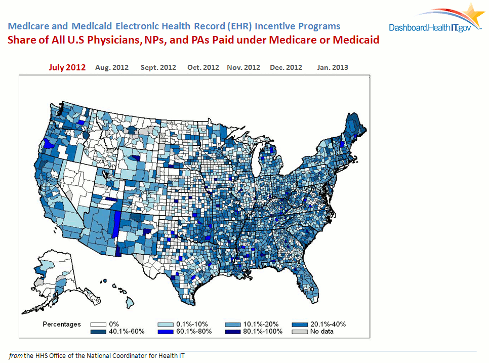 Share of All U.S. Physicians, Nurse Practitioners, and Physician’s Assistants Paid through the Medicare and Medicaid EHR Incentive Programs from July 2012 to January 2013